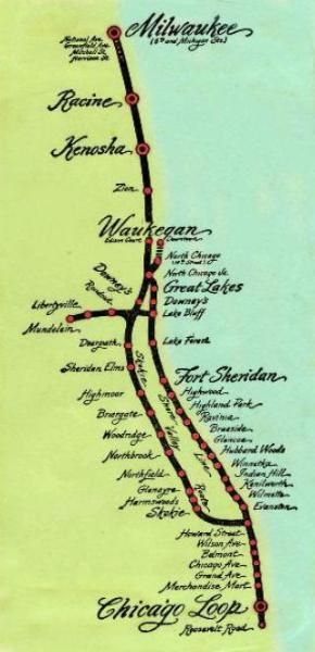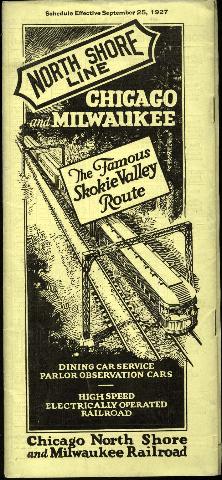 HISTORICAL HIGHLIGHTS May 29, 1896 - Bluff City Electric Railway begins streetcar operations in Waukegan. May 12, 1898 - Line is expanding with vision to reach Chicago and Milwaukee. Becomes Chicago & Milwaukee Electric. Dec. 2, 1905 - Service reaches Kenosha. Sept. 2, 1906 - Service reaches Racine. Sept. 1, 1907 - Local streetcar operations begin in Milwaukee. Oct. 31, 1908 - Interurban service begins Evanston to Milwaukee. July 26, 1916 - Sam Insull takes control. C&ME becomes Chicago, North Shore & Milwaukee (CNS&M) aka North Shore Line (NSL). Aug. 6, 1919 - Direct service begins between Milwaukee and Chicago "Loop". Sept. 14, 1920 - New Milwaukee station opens. 1923 - Parlor-Observation service begins. June 5, 1926 - New Skokie Valley route opens bypassing shoreline communities. June 24, 1926 - Eucharistic Council near Mundelein draws over 75,000 riders from Milwaukee, Waukegan and Chicago. North Shore Line operates 445 trains in one day using their equipment and Chicago "L" cars. Most trains running 2 to 15 minutes apart. May 1926 - Begin "Ferry Truck" (Piggyback) freight operation. April 23, 1932 - End of Parlor-Observation service. Cars rebuilt into regular coaches, but lacking restrooms. Sept. 30, 1932 - Line in bankruptcy and receivership. Insull resigns. 1936 - Cars equipped with new wheel design offering more stable ride. 1930's - WPA project separates grade of CNS&M and CNW eliminating road crossings through Glencoe, Winnetka and Kenilworth. Feb. 1941 - Two Electroliners begin service. They were the most modern electric railway equipment of the time. Self contained four-car articulated trains, with electric heating and air-conditioning and a tavern-lounge car. Cooking of burgers and light meals was done on an electric stove. Although capable of speeds over 100mph, they were limited to the 80mph range of the standard cars. 1947 - End Waukegan city streetcar service. April 30, 1947 - End of "Piggyback" service. 1951 - Several cars remodeled as "Silverliners". Aug. 12, 1951 - End of Milwaukee city streetcar service. 1953 - Railroad reorganized as CNS System later known as Susquehanna Corp. July 24, 1955 - End of Shoreline route service. Single track remains to Highwood shops. Jan. 19, 1963 - Last operation between Lake Bluff and Mundelein Jan. 21, 1963 - End of all interurban passenger service. Jan. 26, 1963 - Last of passenger cars and freight cars removed from line.