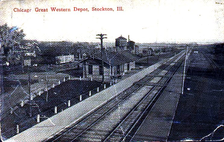 A post card depicting the depot and rail yard at Stocton Ill. Circa 1912 by R.G. Rottler in Stockton, Ill. Courtesy Rick Behrendt