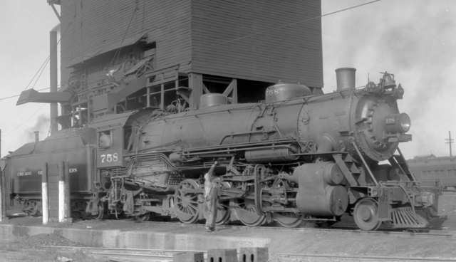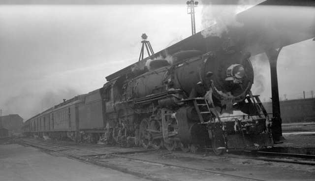 CGW 752 type 2-8-2, with passenger train, winter, 1937.
