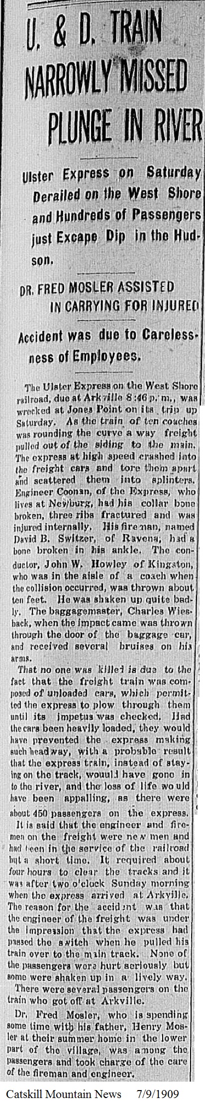 U&D Train Narrowly Missed Plunge in RiverCatskill Mountain NewsJuly 9, 1909