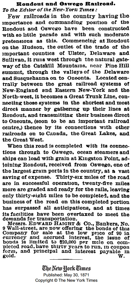 Rondout & Oswego RailroadNew York TimesMay 30, 1871