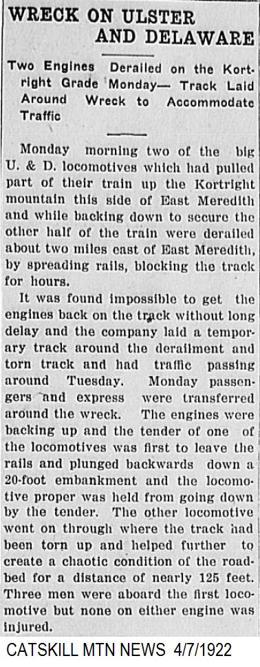 Wreck on Ulster & DelawareCatskill Mountain NewsApril 7, 1922