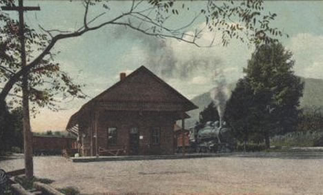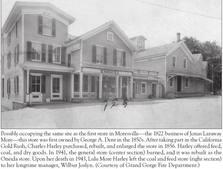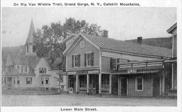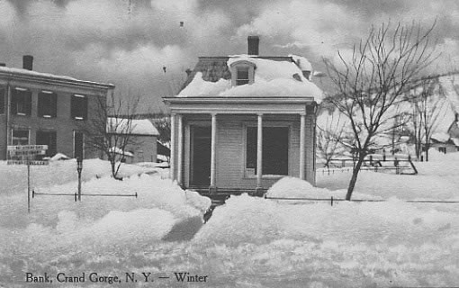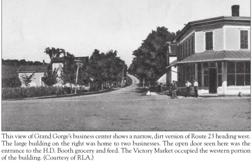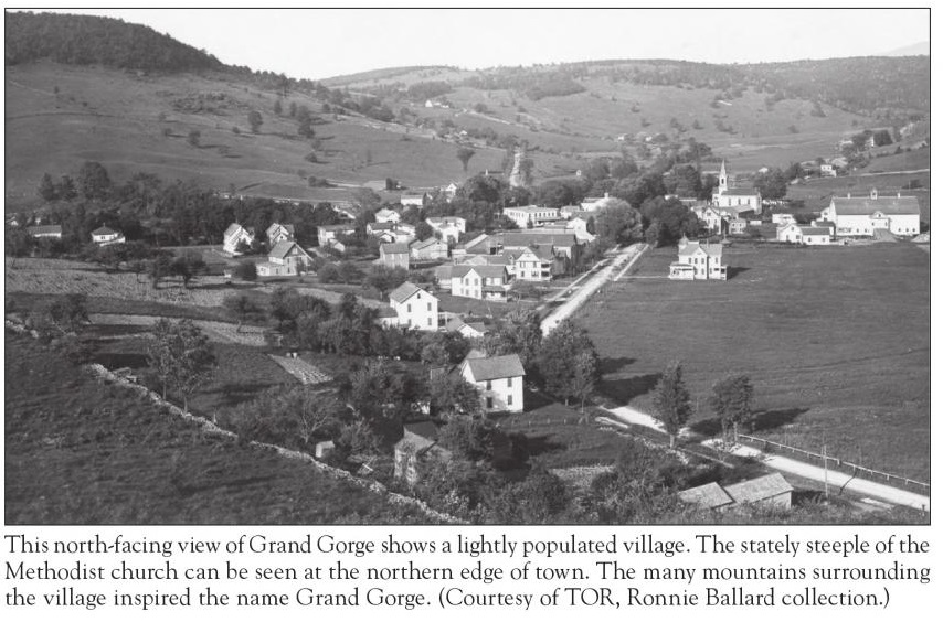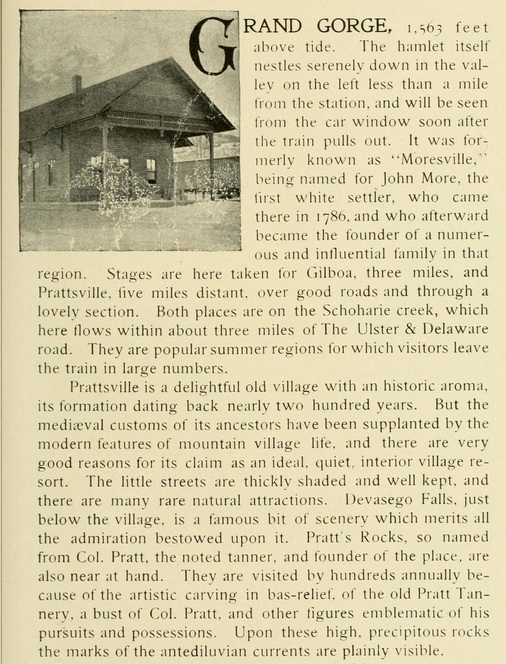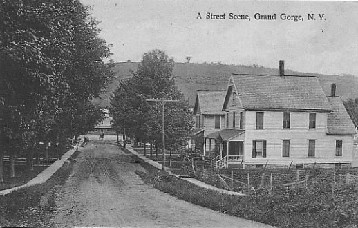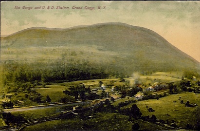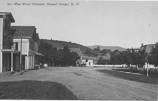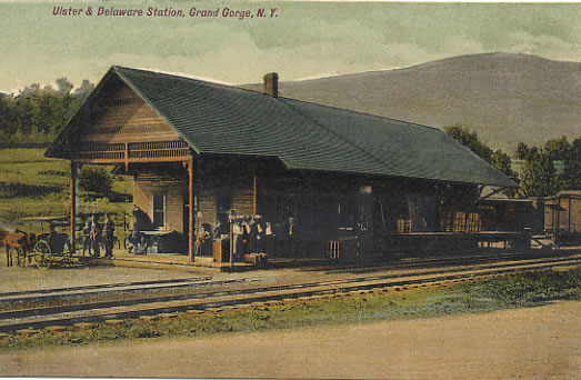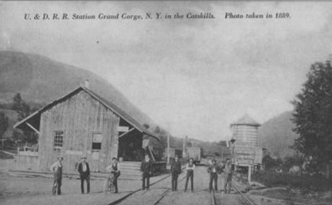 Grading crews, coming from Roxbury and up "the Gorge," reached Moresville in the spring of 1872. A board-and-batten type station was constructed just a half mile outside of the hamlet, where Ferris Hill Road meets Route 30. The first train reached Moresville on August 8, 1872 (Source: Best). Less than two years later, on June 22, 1874, the residents of Moresville elected to change the name of their hamlet to "Grand Gorge." The reason was due to confusion with mail meant for "Moresville" going to other villages called "Mooresville." The residents feeling their gorge, located just to the south of the hamlet, was quite "grand" opted to change the name of the hamlet to the aforementioned name.