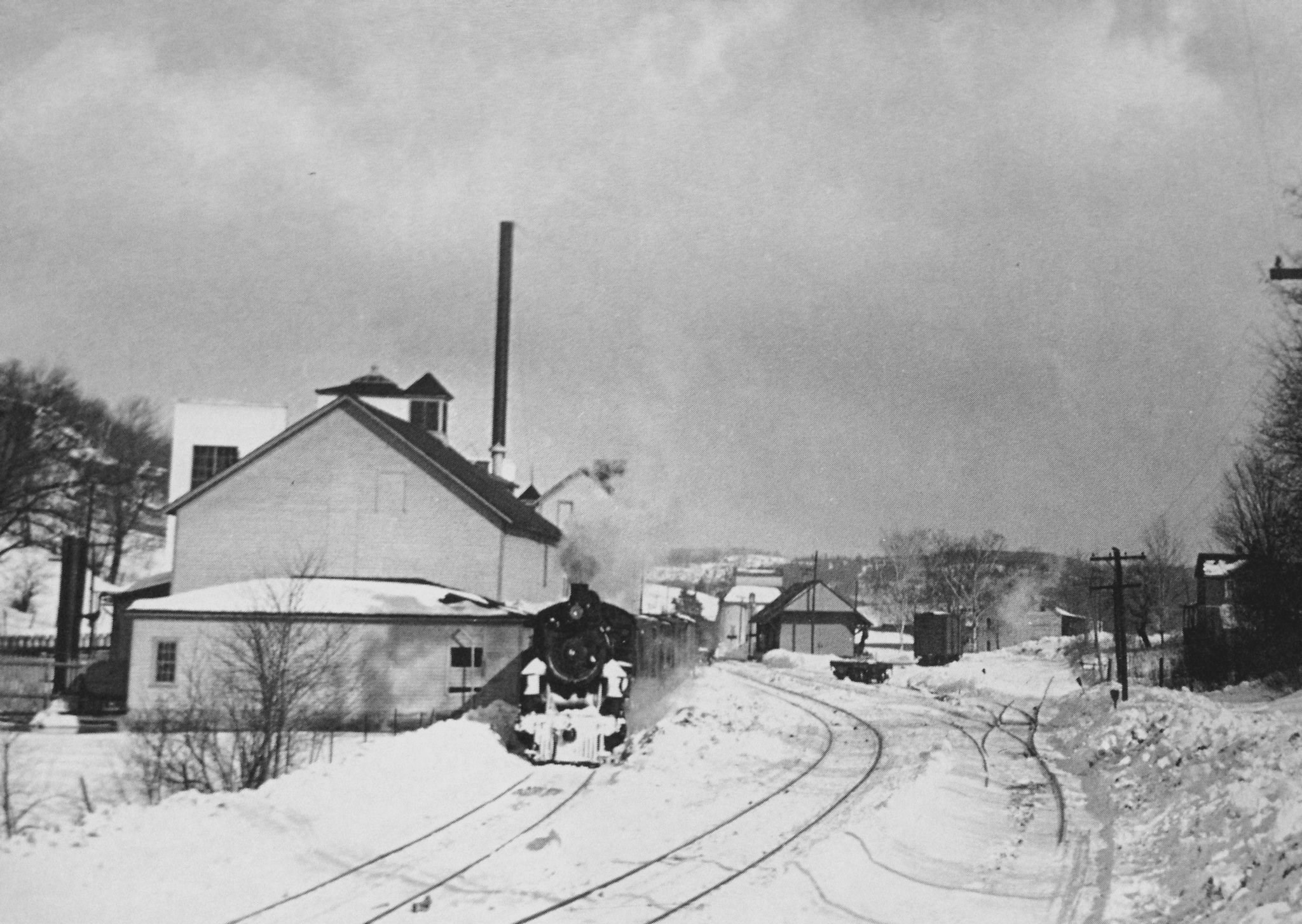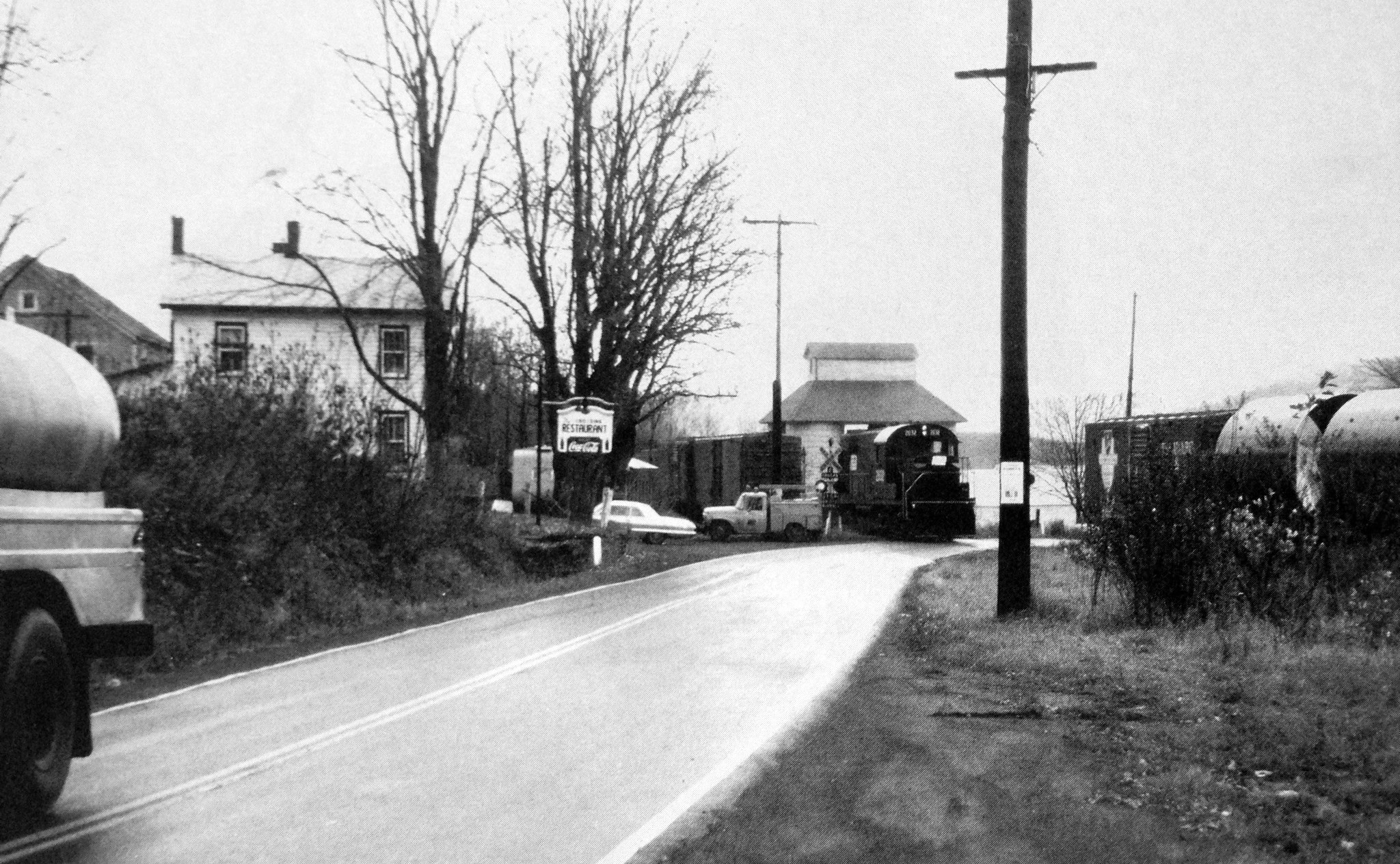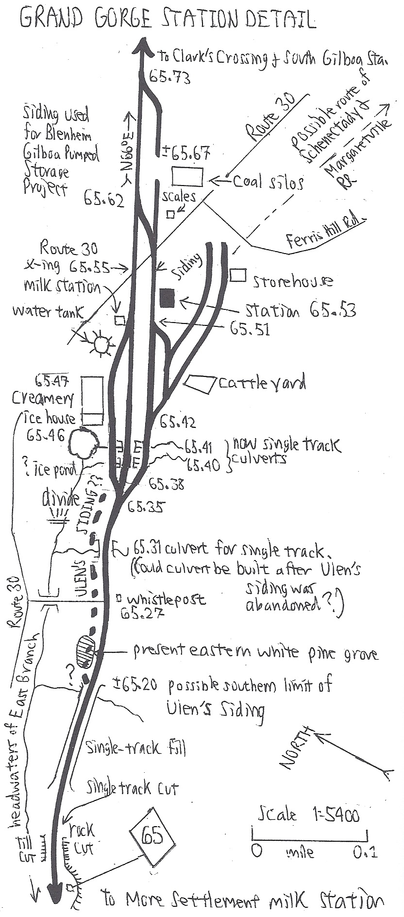 Grand Gorge Station: Originally built c.1872 as "Moresville Station." Name changed in 1874. Original station burned in 1891, replaced with a larger structure that was torn down in 1960. The station was closed at the end of passengers service in 1954. Passing Siding: The passing siding at Grand Gorge was 1,078 feet long in 1908 and was later lengthened to 1,408 feet to hold twenty cars. It held 26 forty-foot cars in 1924 and 1930 and 24 forty-three foot cars in 1935. Water Tank: A water tank, for servicing the steam locomotives, was located south of the original station (c.1872-1891). Section House: A section tool house was located near the north end of the yard. Industry: The Slawson-Decker Creamery (later Sheffield Farms, see more below) was located here and had a siding. There was an ice house and pond at the south end, and a milk station at the north end. The building is now Becker's, a tire dealer. There was also a cattle yard and storehouse located here, behind the station, in early years. There were coal silos, a coal trestle, a coal shed, and scales located on the north side of Route 30. The owner is unknown, but perhaps it was a co-op of local coal dealers taking deliveries of coal via the railroad. Ulen's Siding: This siding was used in conjunction with the construction of the Gilboa Dam and Schoharie Reservoir, which were completed in 1926. A siding here was used in 1970 for the offloading of pipe and other equipment bound for the Blenheim-Gilboa Pumped Storage Project, just a few miles to the north of this location.