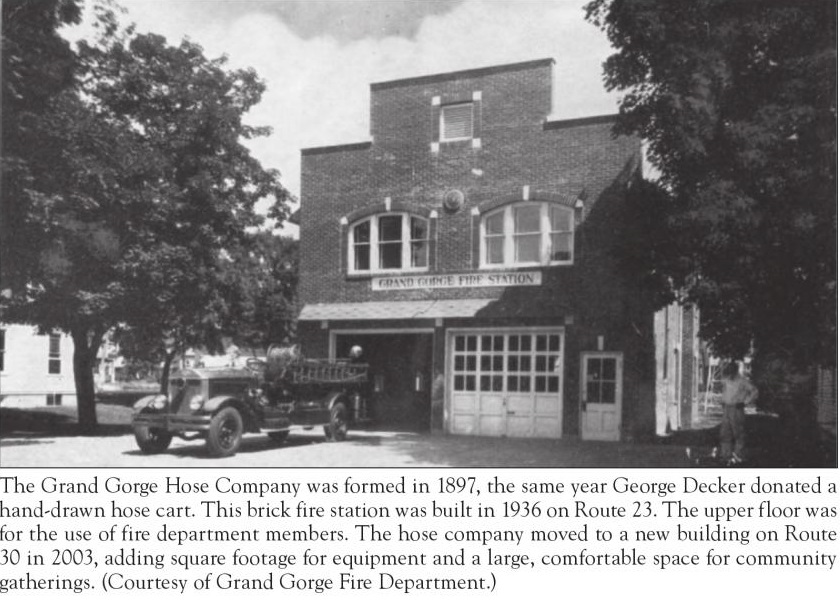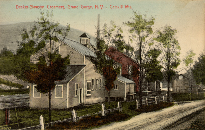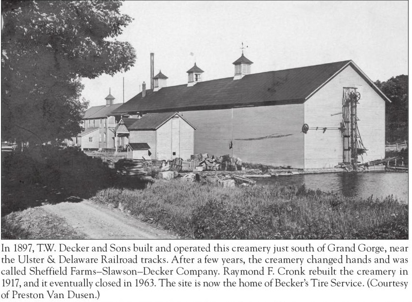 In 1897, T.W. Decker and Sons built a creamery on the railroad where the Sheffield plant was located, the Roxbury side of Grand Gorge. The Deckers operated this for several years, then the farm changed to the Sheffield Farms, Slawson-Decker Company, Inc. In 1917, the creamery built in 1897 was completely rebuilt and remodeled by Raymond F. Cronk, the first of several Sheffield creameries that he built, in different parts of New York and in Pennsylvania. That creamery continued in business until 1963, when the Sheffield creamery ceased operations. The building stood idle for five years, then was purchased in 1968, by the Becker Tire Service, which also sells feed. The patrons took their milk either to the Daitch Creamery in Roxbury or to Hobart, since closed. From History of the Town of Roxbury by Irma Mae Griffin.