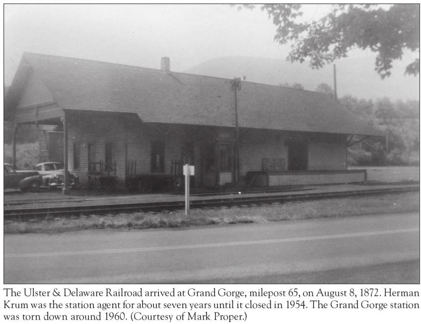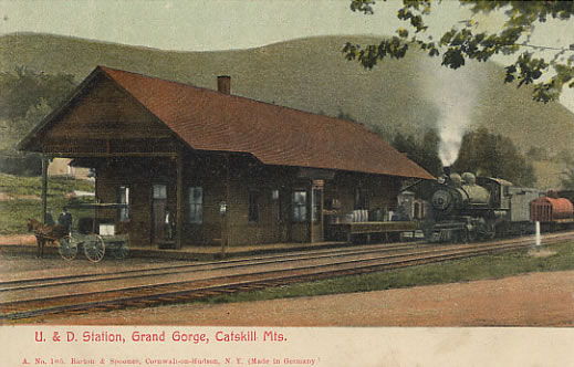 Grand Gorge Station (MP 65.53) was located just a half-mile southwest of the center of the hamlet, where Ferris Hill Road meets present-day Route 30. Originally called "Moresville" when the first train reached here on August 8, 1872, the name was soon changed to "Grand Gorge" on June 22, 1874. The original "board-and-batten" station building succumb to fire in 1891 and was replaced by a larger structure. Passengers could disembark here for stagecoach connections to nearby towns such as Prattsville and Gilboa, but Grand Gorge Station handled a greater deal of freight than it did passengers. Great deals of farm and dairy products were handled here for shipment to larger markets in such places as New York City and New Jersey. The earliest recorded Station Agent posted here was Orrin Day Wood who served many years. Harry Ennis was the Station Agent here from the 1920's through to the 1940's before he was transferred. Mr. Riley of Phoenicia and Orrie Smith of East Meredith were both here a short time, but Herman Krum was the Station Agent from about seven years before the station closed in 1954. The Grand Gorge Station was closed in 1954 after all passenger service was discontinued on the Catskill Mountain Branch (former Ulster & Delaware Railroad). The station was torn down in 1960 after deteriorating a great deal.