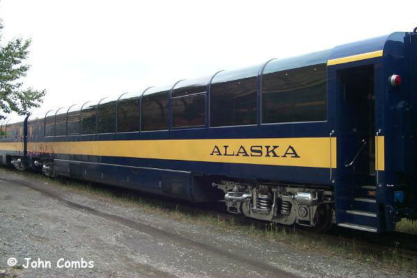 Notes: Along with several other cars, Alaska Railroad 552 was built for the ambitious Florida Fun Train, a service that had a very brief life running between Ft. Lauderdale and Orlando, FL. The train had a total of four single level domes, along with two dining/restaurant cars, a theatre car and an innovative arcade car that included virtual reality games and video games. Unfortunately, the service quickly failed due to lack of ridership and some legal snarls, and the 552 and the rest of the train reposed until sold to the Alaska Railroad in 1999. The 552 was constructed using the center sill of former Canadian National baggage car, CN 9269, which was built in May, 1957 and later became CN 9648 and VIA 9648 before being retired. The car body is presently in use as a storage shed at CRM's plant. After being renumbered and repainted at Colorado Railcar, the 551, 552, 553, 554 and business car 2000 (along with the other four FFT cars) were shipped to Alaska and placed in service on the Grandview Glacier Discovery Train between Anchorage and Grandview. I understand that the garish interiors intended to represent the flamboyance of the Florida lifestyle but out of place in Alaska will be replaced as they begin to wear. Update: These cars are set to be refurbished over the winter 2004-2005 with larger seats. No word yet on exact styling, but the cars will retain their four-top table configuration.