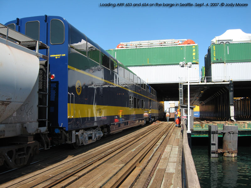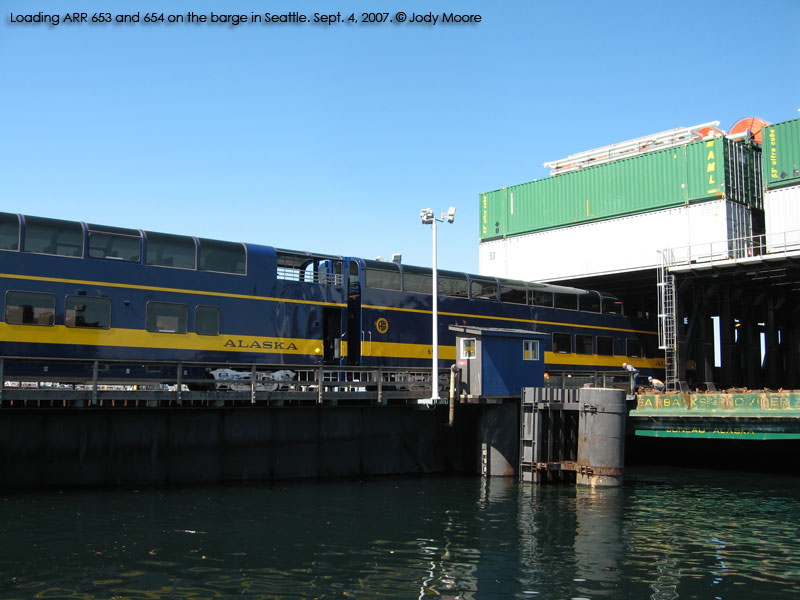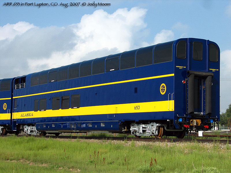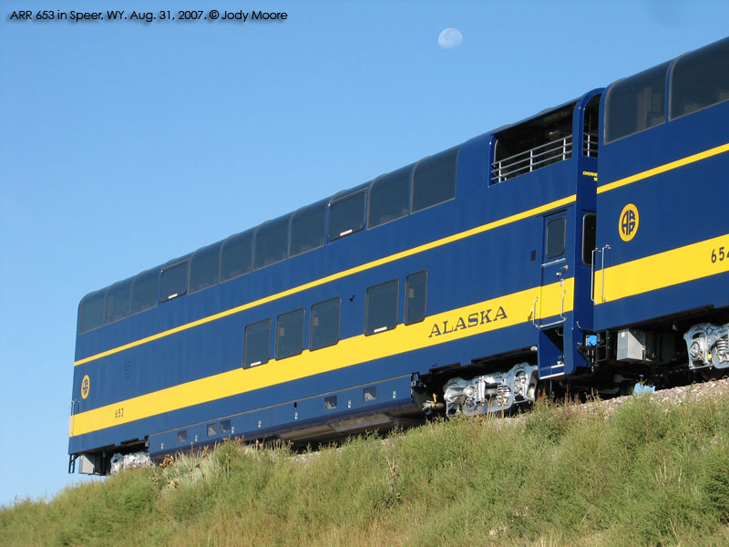 Notes: Since its inception with the delivery of dome cars 651 and 652 back in 2005, Alaska Railroad's Goldstar service has been wildly popular. Before the first pair of cars were delivered, they were virtually completely sold out for their first season. For 2007, the Alaska Railroad augmented its Goldstar fleet with two more cars, ARR 653 and 654. Like the previous two cars, the 653 and 654 seat 72 riders in the dome. The cars will also have the trademark upper level observation platform that debuted on those first two cars. The cars will also be ADA accessible, with ADA restrooms, dining area seating, and wheelchair lifts to the upper level. |