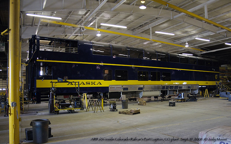 Notes: Since its inception with the delivery of dome cars 651 and 652 back in 2005, Alaska Railroad's Goldstar service has been wildly popular. Before the first pair of cars were delivered, they were virtually completely sold out for their first season. For 2007, the Alaska Railroad augmented its Goldstar fleet with two more cars, ARR 653 and 654, and added two additional cars in 2008. Like the previous four cars, the 655 and 656 seat 72 riders in the dome. The cars will also have the trademark upper level observation platform that debuted on those first two cars. The cars will also be ADA accessible, with ADA restrooms, dining area seating, and wheelchair lifts to the upper level. |