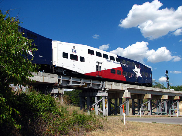 Bombardier has made its presence felt in the North American market with the bilevel coaches orginally designed for service on Toronto's GO Transit and built originally by Hawker-Siddley beginning in 1976. The cars have been widely received, and can be found in service all over the continent, from Seattle, WA to San Diego, CA to Miami, FL. According to Bombardier, over 650 bilevel cars are in service. The car we rode was owned by Trinity Railway Express, and was built new in 2003. TRE rosters a total of 17 bilevel cars, including 12 former GO Transit Hawker-Siddley cars that were among the first built. Given the age of the design, I do not know if any of the cars are FRA compliant. The cars are important to the market in that they put two full size levels of passenger area into a relatively compact area. The intermediate level above the trucks is used for passenger seating as well, reached by stairs up from the lower level or down from the top level. The HVAC units and other equipment are stored above the intermediate levels.
