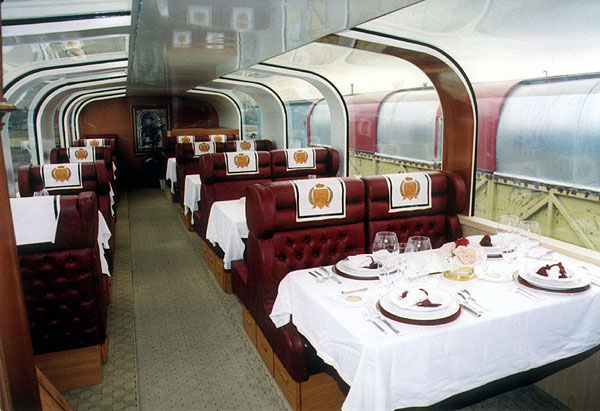 Looking the other direction from the previous photo, you can see the dining area that occupies the far end of the car. At this point, we are on the end of the car that faced the camera in the first photo, directly above the entrance. You can see the plated over windows of the unfinished end of the SC-1 beside us. It was at about this point that I started to realize that a lot of what was in the car was for show. Closer inspection of the crests on the headrests, the seats, and other components revealed that they had been put together for looks and not for operation. That's OK with me, as it serves the purpose that the car has been designated for. From a distance like this, the effect is quite convincing. I've seen several promotional photos taken in the cars, and would have never guessed had I not scrutinized the construction up close. The LC-2 and SC-1 are not operable cars. Too bad, because I'd love to take a trip within their walls. But in their present state, it's easy to be tantalized by what they represent: A very unique "outside the box" vision for the application of Colorado Railcar's ultradome design. And who knows. Maybe we will get to see them on the rail for real some day. Colorado Railcar's principals are seeking financing to launch the luxurious Golden Eagle cruise train, which the preliminary literature says would sleep 60, with two sleepers, a lounge car and a diner. Sounds like that could easily end up being the SC-1, SC-2, LC-2 and SPA respectively. Wouldn't that be great? Use the back button on your browser to return to the car roster page that you came from. |