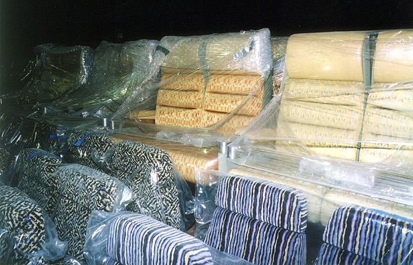 Two different styles of seats in four different samples of decor. The top seats are destined for RMR 9523, while the other seats will be used in the Holland America cars. Row after row of the sealed up seats were staged along one wall of the complex awaiting installation in the railcars once they near completion. At the time of the visit, none of the cars had seats installed.