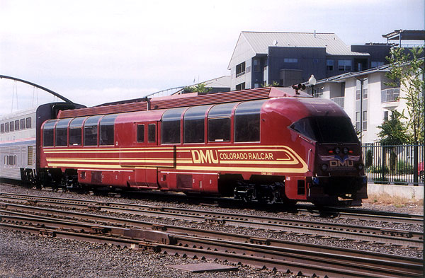 A tour of the DMU Interior On July 14, 2003, Michelle and I ventured to Portland, OR Union Station to meet up with Colorado Railcar for a semi-private viewing of the DMU demonstrator, CRMX 2002, as it passed through town on the tail end of Amtrak's Coast Starlight train. The car was on its way from a demonstration in California to a special tour on the Alaska Railroad. Hopes are high for the folks at CRM, as the idea was originally fostered by the ARR's voiced desire for a modern option to the aging Budd Rail Diesel Cars (RDC) used on some of the more remote lines that the ARR provides passenger service to. Following delays the day before, the Starlight was running late, and was expected to be over an hour later than its scheduled 4:20 arrival time. With an expected ETA of 5:35, we were quite surprised when a horn at 5:05 signaled the train's arrival, crossing the street near the station.