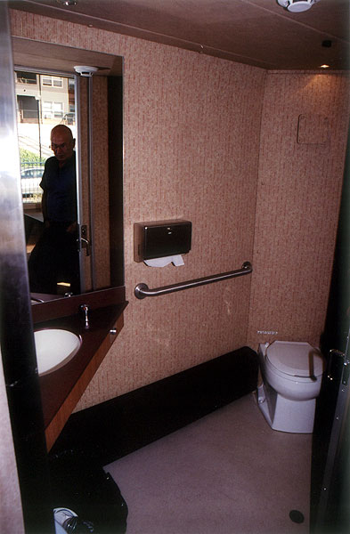 Directly across from the wheelchair tiedown spots is this spacious ADA-compliant restroom that puts other commuter potties to shame. The roominess and sink appointments reflect Colorado Railcar's history as a luxury car builder. All too soon, it was time to deboard and let the train continue on its way. Turnaround time on the Starlight had been trimmed to a lean 15 minutes, so we allowed ourselves only 10 to soak in the view and form our opinions. All in all, the car shows the same quality workmanship that I have seen on other CRM products. And the wraparound windows really add a festive atmosphere to what could be an otherwise dreary commute. I wonder, though, how much acceptance the windows and their hefty replacement price tag will find in a world where vandalism is a reality, and many people can't show respect for anything, regardless of the cost... We headed off of the Portland Union Station platform with the intent of getting a shot of the DMU in full sunlight as it departed. But we were far from the end of the station when the Coast Starlight whistled off to begin the final leg of its two day journey from Los Angeles to Seattle. The sleek lines of the car made the train appear to be moving very quickly as it slid between the platforms, out from alongside one of the Cascades Talgo sets and on north. I suspect that the DMU will be received well. Already, a commuter agency in Orlando, Fla. has placed an order for a complete set to study the concept further. As the first car to meet the FRA crashworthiness standards, and as an all-American built car, DMU at least stands a chance of being a standup favorite among competitors in the increasingly fierce commuter market. Colorado Railcar's choice of using proven industry components in the trucks, transmissions and power plant will probably also ring well with cost-conscious agencies that operate on a shoestring budget. I hope that you have enjoyed this up close and personal tour through Colorado Railcar's DMU demonstrator 2002. I look forward to touring more DMU products in the future. Back to the Commuter Options page. |