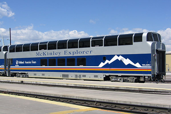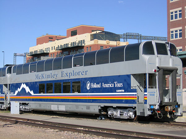 As seen on the 1058 at DUS, the cars still feature the unique canted end windows that were intended to invoke the memory of the Budd full dome cars that the CRM cars displaced. As single use cars, the 1058 and 1059 feature not only a kitchen and dining area but a small observation platform and a gift area inside the end doors. Like the other Holland America cars, the C cars carry names of Alaskan locations. The 1058 is named Kashwitna, while the 1059 is named Teklanika.