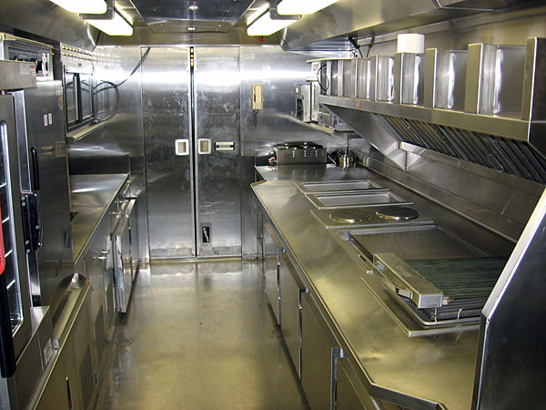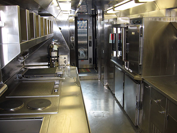Looking toward the dining area of the 1058, you can see the well appointed galley, including the grill, stove top, steam tables and small wait station.