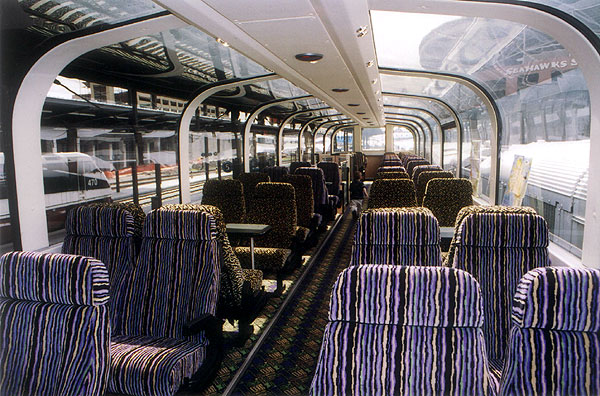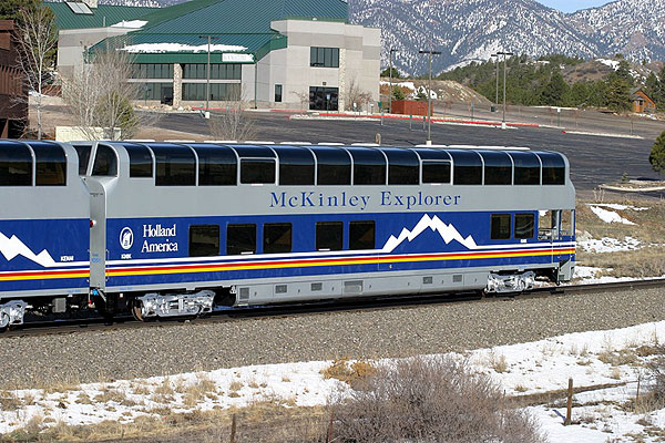 Notes: Named "Knik". When Holland America turned to Colorado Railcar to augment its fleet of vintage Budd and ex-Milwaukee Road vintage full domes, the result was something quite different from the other ultradomes built thus far. The initial order, HALX 1050-1053, feature sloped dome ends that more closely resemble the Budd products of 50 years earlier, as well as other ammenities. They are divided into two types, A and B. 1051 is a B car, fitted with ADA acessible seating and wheelchair lifts. Both the A and B cars have ADA accessible restrooms and dining facilities. The B cars also feature an eight by eight foot platform, and a small gift area inside the car. After construction, 1050 and 1051 were placed on display at several locations along the west coast before being shipped to Alaska. They were scheduled to enter service between Anchorage and Fairbanks, AK in May. Click here to see a complete tour of the 1050 and 1051 that I took while the cars were on display at Seattle's King Street Station. Return to the roster page |