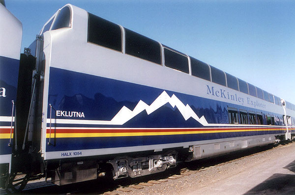 Notes: Named "Eklutna". Holland America 1054-1057 represent the completion of an eight car order for the largest dome cars ever built (at least as of early 2004.) The previous cars - HALX 1050-1053 - were delivered in the spring of 2003. This group was delivered on March 7, 2004. HALX 1054 is an A coach, with a full kitchen, but no observation platform or lounge. The A cars have a slightly larger dining area, with 44 seats as opposed to 40 in the B cars. In design and decor, the new cars are almost indistinguishable from the earlier cars in the order. All eight cars are used in Holland America's luxury service on the Alaska Railroad, hauling cruise passengers behind the ARR's Denali Star passenger train between Anchorage and Fairbanks. With the delivery of these four cars to Holland America, the majority of their fleet of vintage Budd domes will be retired, with several being stored for other service. In November, 2003, I visited Colorado Railcar's plant in Ft. Lupton, CO and had the chance to tour the 1055 while it was under construction. You can see the photos here.