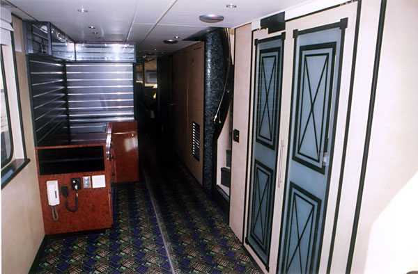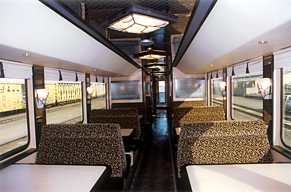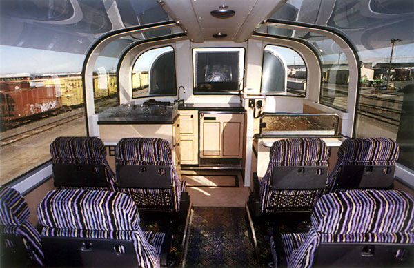 The sound system mentioned in the construction preview has been installed, and the service bar is now in place at the front of the car. One thing I like with these cars is the liberal use of accent glass, like that at the edge of the stair well and the counter edge. Note also the slight difference in layout when compared to car 1054, shown in the first page of the HALX car tour and delivery section.