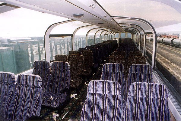 The dome interior has been fleshed out, and looks much more complete with the seats in place and the finishing touches added. All that is missing now is a load of passengers and some spectacular scenery and everything will be finished. Note the air vents visible along the window on the right, part of the patented HVAC system mentioned in the tour of RMR 9523, also under construction at Ft. Lupton. I hope you have enjoyed this tour of the finished version of Holland America 1055. It was quite a treat for me to get to see this car in its completed state, after having visited it during its construction. Use the back button on your browser to return to the car roster page that you came from, or follow this link to see a complete tour of all four cars, and some photos from their delivery to Holland America. |