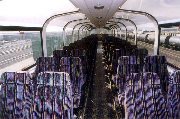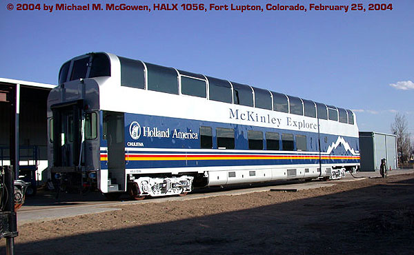 Notes: Named "Chulitna". Holland America 1054-1057 represent the completion of an eight car order for the largest dome cars ever built (at least as of early 2004.) The previous cars - HALX 1050-1053 - were delivered in the spring of 2003. This group was delivered on March 7, 2004. HALX 1056 is an A coach, with a full kitchen, but no observation platform or lounge. The A cars have a slightly larger dining area, with 44 seats as opposed to 40 in the B cars. In design and decor, the new cars are almost indistinguishable from the earlier cars in the order. All eight cars are used in Holland America's luxury service on the Alaska Railroad, hauling cruise passengers behind the ARR's Denali Star passenger train between Anchorage and Fairbanks. With the delivery of these four cars to Holland America, the majority of their fleet of vintage Budd domes will be retired, with several being stored for other service. In November, 2003, I visited Colorado Railcar's plant in Ft. Lupton, CO and had the chance to tour the 1055 while it was under construction. You can see the photos here.