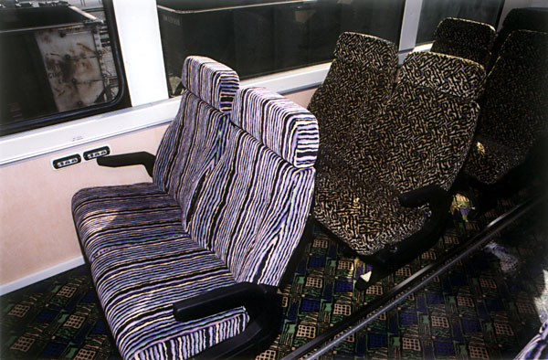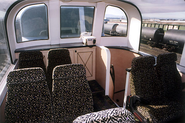 All of the cars feature the same basic configuration on the leading end that we see here on the 1054: Stairway on one side, and a small service bar (with liberal storage, as you can see) for serving drinks and light fare to riders during their trip. One thing of note is the sculpture on the top of the stairwell. As with the previous order, these cars feature installable tables. (See the tour of HALX 1050 and 1051 for details.) I did find it interesting that there is a similar table for passengers in the front row of seats, which folds down flush with the wall.