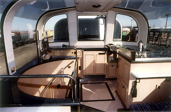 One feature I wasn't previously aware of is the small window in the galley. This handy feature for kitchen-bound staff yearning for a glimpse of the sun was first installed on Royal Celebrity Tours' second order of cars, RCIX 1003 and 1004, and carried on with the first order of Holland America cars. Click here to proceed to page two of our tour, or use the back button on your browser to return to the car roster page that you came from. |