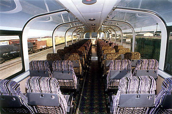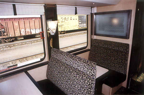 One thing that was different in this order of dome cars was the installation of the dining room artwork, which wasn't put into the first cars until it arrived in Seattle. Though not well displayed in this photo, the glass wall hanging at right actually changes colors as the train moves, via a set of computerized motion detectors, and a number of fiberoptic lights .