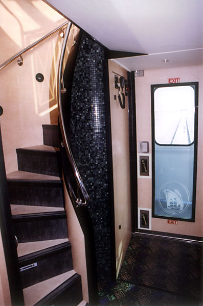 One of the other minor variations in the design is the removal of the lighting that accented the edges of each step in the stairway. Note the marble tiles on the wall outside the staircase, and the Holland America logo etched into the glass on the door. I didn't get good photos of this feature on the other cars, but it was present.