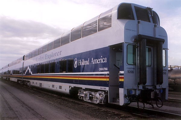 For the most part, Holland America's new domes are exact duplicates of the previous four cars, which I toured last year. When I found the cars, they were staged at the end of train M-PASINB-14, a Pasco to Interbay, WA manifest freight. An overcast had dawned over the Pasco yards, but was soon to be replaced by sunny skies as I began my tour. From this end, the cars are: HALX 1056 (named Chulitna), 1055 (Nenana), 1054 (Eklutna) and 1057 (Talkeenta).