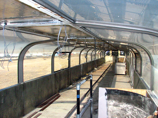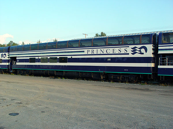 Princess’ cars operate in five car sets, lettered A through E, in order. They are arranged so the location of kitchens and dining rooms makes serving meals easier and more efficient. Princess’ cars operate at the end of the Alaska Railroad’s Denali Star passenger train between Anchorage and Fairbanks, AK. Cars 7088 and 7089 are designated as D cars. They were built in 1999, and are the only cars in the Princess fleet to be constructed at CRM’s Ft. Lupton plant. The kitchen is on the leading end of the car, with the dining room at the back, adjacent to the dining room in the trailing E cars, 7084 and 7085. Like the other cars in the Princess fleet, the 7088 and 7089 seat 88 passengers upstairs, and 32 in the dining area. The D cars will receive a general refitting and renewal during the 2005-2006 winter off-season, which will include new interior upholstery, seating and décor, and new exterior paint. It is expected that the work is to be performed by Colorado Railcar in Ft. Lupton.