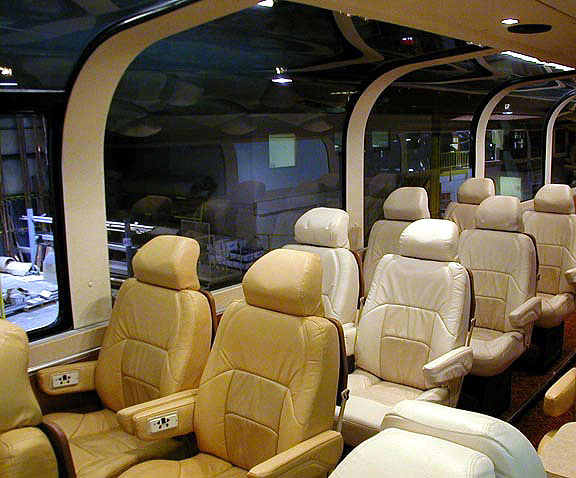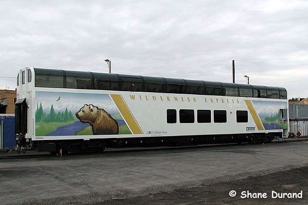 Notes: The combined efforts of cruise lines Royal Carribean and Celebrity Cruises created Royal Celebrity Tours, the company which handles all of the Alaskan shore excursions for both companies. As a part of that mission, Royal Celebrity Tours introduced two ultradome-type cars in 2001 for their Wilderness Express service. The cars were designed to be completely self contained, and feature a small observation platform, a kitchen, dining room, and of course the requesite top level seating. Royal Celebrity sought to distinguish itself by creating the tallest domes that had been built to that date. Whereas previous domes for rival Princess Tours stood 17 feet, six inches tall, the Wilderness Express cars are 18 feet, one inch tall, with the difference split between the two floors. Following their construction, the cars were sent on a barnstorming tour of the North American continent before being shipped to Alaska. (Your webmaster made a two hour drive to Portland, OR just to see the cars, only to find out that the schedule he had been provided was incorrect, and the cars had been there the day before and now were in Seattle, another four hours away. Though my wife in her patience was game to the trip, I ruled it out for some reason or another...) The Wilderness Express cars are also luxuriously appointed with plush rotatable seating, and individual sound systems. Under their operating agreement with the Alaska Railroad, the Wilderness Express cars are the first cars behind the regular revenue cars on the ARR's train between Anchorage and Fairbanks. Trains typically feature one or two cars.