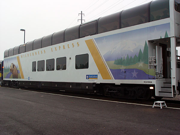 Notes: The combined efforts of cruise lines Royal Carribean and Celebrity Cruises created Royal Celebrity Tours, the company which handles all of the Alaskan shore excursions for both companies. As a part of that mission, Royal Celebrity Tours introduced two ultradome-type cars in 2001 for their Wilderness Express service, then followed with a second order for two cars the following year. The cars were designed to be completely self contained, and feature a small observation platform, a kitchen, dining room, and of course the requesite top level seating. Royal Celebrity sought to distinguish itself by creating the tallest domes that had been built to that date. Whereas previous domes for rival Princess Tours stood 17 feet, six inches tall, the Wilderness Express cars are 18 feet, one inch tall, with the difference split between the two floors. The Wilderness Express cars are also luxuriously appointed with plush rotatable seating, and individual sound systems. Under their operating agreement with the Alaska Railroad, the Wilderness Express cars are the first cars behind the regular revenue cars on the ARR's train between Anchorage and Fairbanks. Trains typically feature one or two cars.