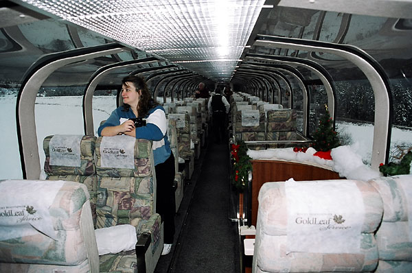 Notes: Rocky Mountaineer's Goldleaf service domes comprise the largest single fleet of Colorado Railcar domes presently in service. 9506 is among the latest of 12 cars in service or soon to be on RMR's two day rail cruise offering between Vancouver, BC and Jasper, Banff and Calgary, AB. RMR has enlarged its fleet by an average of 1-2 cars per year since purchasing its first Ultradome in 1995. The first 10 cars are unique among CRM domes in that they have smaller panes of glass in the dome level. Each pane is matched up to a row of seats, affording the best possible view for all riders. The cars also have the lowest capacity among the domes - 72 dome seats and 36 dining seats, which translates into a slightly roomier fit for each passenger. 9506 is an A car, with a small galley next to the dining area. It is also equipped with a small service bar on one end of the dome. Click here to see a complete tour of Rocky Mountaineer car 9509 at the historic Canadian National depot in Kamloops, BC. Return to the roster page |