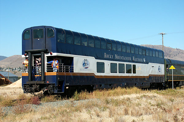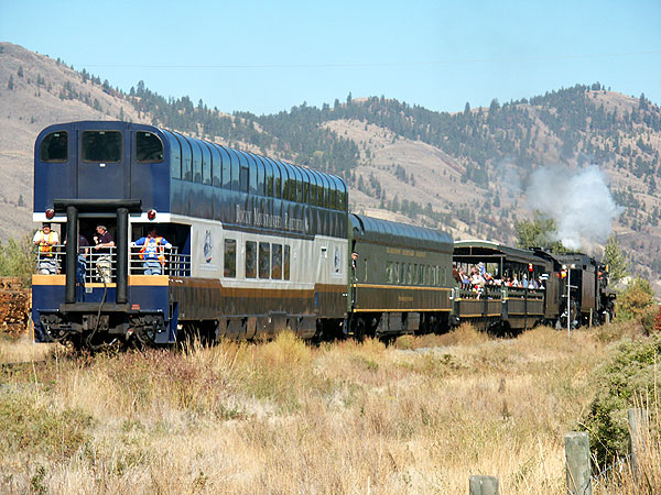 Rocky Mountaineer dome trailing steam! Every year, the steam-powered Kamloops Heritage Railway runs its Kamloops Railway Days specials. The KHR is a great little tourist operation in the heart of Kamloops, BC. Trains run from the beautiful CN depot, three miles to the edge of the CN yard and back with former Canadian Northern 2141, a beautifully restored 1912-built 2-8-0 that is owned and operated by the Kamloops Heritage Railway Society. The Society also owns several passenger cars and some other interesting equipment, including a stock car, wooden caboose, and a wedge snowplow. This is a neat little organization that is deserving of a look. The equipment is skillfully restored, and looks great. The Society is presently in the process of restoring ex-Comox Logging Ry. 2-8-2 no. 16, which is owned by the West Coast Rail Association, and will be used in Kamloops as well for a minimum of five years following its return to steam. Anyhow, like I said before, the KHR is worth a look, doubly so during the annual Railway Days, when even more equipment is imported for a day of special excursions and tours. Past pictures show the likes of CPRail SD90MAC 9300, CP heritage fleet GP38-2 3084, CN SD75i 5712 and GMD-1 1419. And of course, you could be as fortunate as last year's participants were, getting to ride Rocky Mountaineer's Goldleaf dome 9501 behind the 2141 and a special guest...