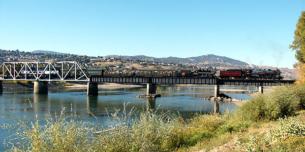 One trip during the event was made with a guest addition - Canadian Pacific's 4-6-4 2816, aka "Empress". Here, we see the doubleheader crossing over the South Thompson River with a four car train. Last in line is Rocky Mountaineer dome RMR 9501, the first dome built for the excursion company. Photo by Gordon Hall, courtesy of the Kamloops Heritage Railway. Sept. 20, 2003.