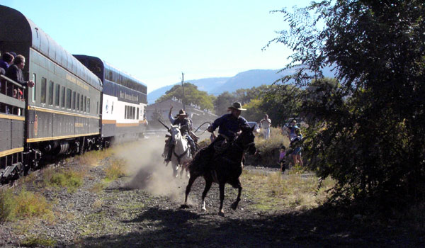 Kamloops holds and honorable attachment to Canada's first train robbery, conducted by a very charismatic rogue named Billy Miner. (Miner is credited as being the first bandit to use the phrase "hands up".) Miner and his gang robbed a Canadian Pacific train near Mission in 1904, escaping across the US border with $6-7,000 in gold dust, $914.37 in cash, and a $50,000 bond. Miner and company were captured near Kamloops in 1906 following another train heist, but he escaped from prison and went on to conduct several more robberies. Though a bandit by trade, most accounts of Miner paint a picture of courtesy. In the 1904 robbery, Miner is quoted as telling his victims "Goodnight boys, sorry to have troubled you." While Miner was captured and escaped several times, and his real fate after being captured in Georgia at the age of 67 isn't clear, actors portraying Miner and his two accomplices frequently attempt to relieve KHR passengers of their valuables even today. It's all in fun, of course, and helps to shed light on a very unique part of the area's history, and on a person who acted in sharp contrast to his notoriously bloodthirsty contemporaries. Photo by Terry Butcher courtesy of the Kamloops Heritage Railway. Sept. 20, 2003(?). Return to the roster page |