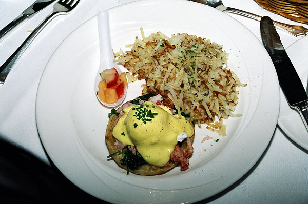 The Food One thing that is conspicuously missing from the Rocky Mountaineer literature is a warning regarding the food. They should probably tell people that the best thing you can do before boarding the train is starve yourself for at least 48 hours, preferably longer. It is hardly an exaggeration to say that we ate one meal – beginning when we first boarded the train and ending shortly before we arrived in Banff. Sure, they made it seem like separate meals, with breakfast and lunch sittings downstairs in the Goldleaf domes, but once the chef’s staff finished handing out cookies and handmade chocolates and tarts as we pulled into the Banff station, I realized that I hadn’t been even remotely hungry at any point during the trip. And to be sure, the formal meals were nothing short of scrumptious. For breakfast, we were treated to four tantalizing options (including at least one vegetarian selection per meal). I chose a terrific derivative of one of my favorite breakfast dishes – eggs benedict – served over lobster instead of canadian bacon. Together with seasoned hash browns and a dollop of fresh fruit (pictured) it was the perfect sendoff from Kamloops. Something that isn’t included in the photo is the variety of extras on the table – pastries, toast and jam, rolls and croissants. There was no shortage of food. I might have included a photo of the fantastic beef strips and potatoes that I chose for lunch had I remembered to shoot one. It was so enticing that for a moment I forgot that I had come with cameras in hand. Not to say that I wasn’t stirred occasionally by the passing scenery (my apologies if I offended my dining mates during lunch by rushing outside every so often with the video camera as we climbed up over Roger’s Pass.) All too soon, the train reached the end of the line in Banff, where we disembarked for the bus trip to Calgary. On the way, we were served – you guessed it – more food. After renting a car, I settled into my hotel for a night’s rest before picking up the chase in the morning. Click here to continue to page 2 of this feature. |