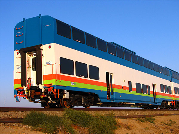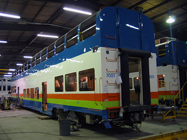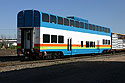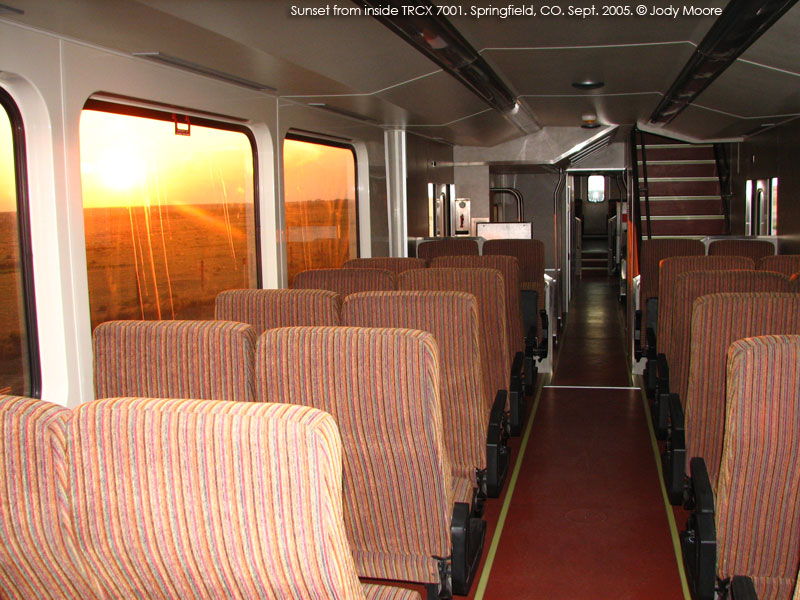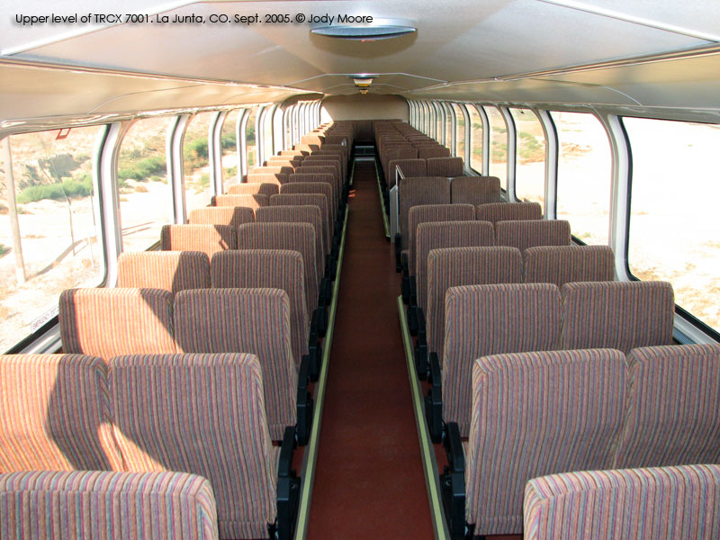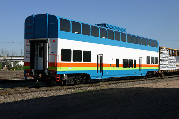 Notes: This unpowered coach contains several firsts for Colorado Railcar. In addition to being the first commuter coach, it is also the first car built with low floor entrances, and has the highest seating capacity of any car built thus far. It also differs from the DMU units in that it has a more traditional center sill rather than the bridge truss frame of the DMUs. This coach - along with its accompanying double Decker DMU - will be remembered as the cars that truly ushered in the commuter production era at CRM. In terms of amenities, this coach seats 182 and features two low-floor entrances on either side of the car. The middle half of the bottom level is low floor, with a short step up at either end to allow clearance for the trucks. (Wheels are a good thing to have on a rail car....) The low floor section seats 18, with additional seating area for ADA passengers. All of the seats can be folded up to provide storage for bicycles. After testing at the AAR's Transportation Test Center in Pueblo, CO in July, 2005, the 7001 was sent to Dallas to be displayed along with DMU TRCX 703 at the APTA show, then returned to Denver for final work before delivery to Florida Tri-Rail. |