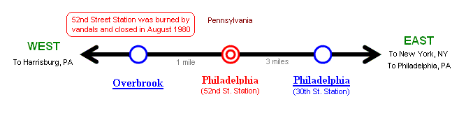 Amtrak Philadelphia 52nd Street Station was located 3 miles west of the 30th Street Station. Amtrak Service to 52nd Street Station ended in August 1980 due to fire damage by vandals. Since then, the station has never been repaired and neither reopened.