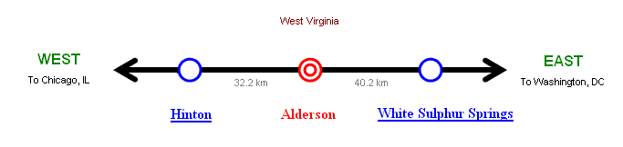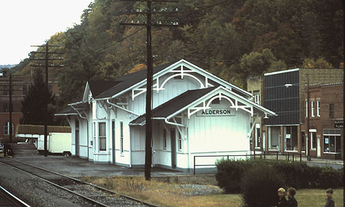 On December 4, 2001, Alderson Station was eliminated from Amtrak Timetables. The flag station, Alderson, was located between Hinton and White Sulphur Springs on the route of Cardinal (Chicago - Cincinnati - Washington, DC). When I visited the station on Aug. 30, 2001, paint job had just finished. Although Cardinals (train #50 and #51) are still operated, the trains don't stop at the new orange-painted station. I hope the trains will stop there again.