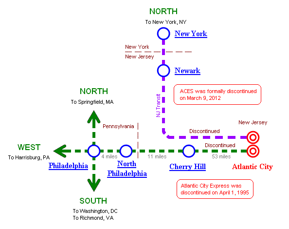 Atlantic City Express Service (Operating Fri Sat Sun only, Seasonal) ACES was formally discontinued on March 9, 2012 |