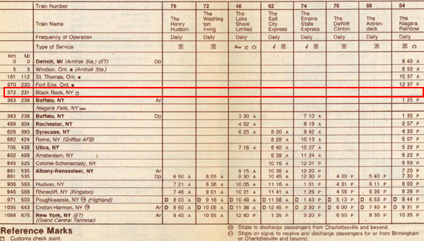 Amtrak timetable showing Black Rock Customs Stop (issued on July 3, 1978) (Source: timetables.org ©1978 National Railroad Passenger Corporation) |