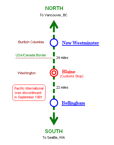 Amtrak Blaine, WA Customs Stop was located 22 miles north of Bellingham, WA, just south of the U.S.-Canada border. White Rock, BC (Canada Customs Stop) located just north of the U.S.-Canada border was also used until 1975. When "Pacific International" was discontinued in September 1981, the Blaine Customs Stop was also eliminated. Amtrak Mount Baker International service to Vancouver, BC started in May 1995, but Blaine Custom Stop has never been shown on Amtrak timetables. The former Great Northern Blaine station building still exists.