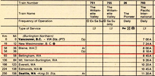 The last Amtrak timetable showing Blaine Customs Stop (issued on April 26, 1981) (Source: timetables.org ©1981 National Railroad Passenger Corporation)