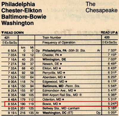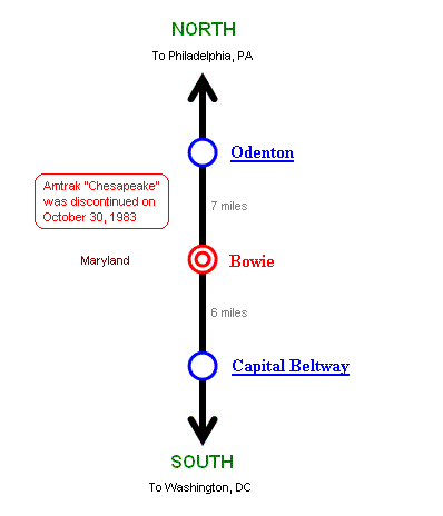 Note: Amtrak "Chesapeake" was discontinued on October 30, 1983, so Amtrak service to Bowie ended. Bowie was replaced with Bowie State Station where currently MARC serves. |
