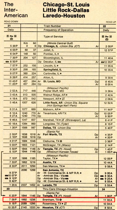 The last Amtrak timetable showing Brenham Station (issued on April 26, 1981) (Source: timetables.org ©1981 National Railroad Passenger Corporation) |