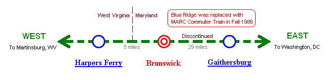 [ Washington, DC - Brunswick, MD - Martinsburg, WV ] Blue Ridge was replaced with MARC Commuter Train in Fall 1986. |