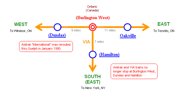 Amtrak/VIA moved from Burlington West, ON to Burlington, ON (GO Station) in 1989. Burlington West Station was located about 0.5 miles southwest of Burlington GO Station. |