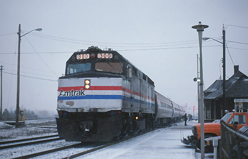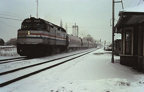 Amtrak Train passing Burlington West, ON Station (March 1993)